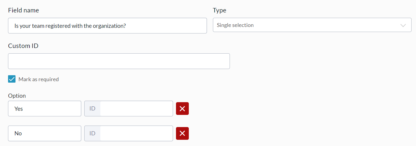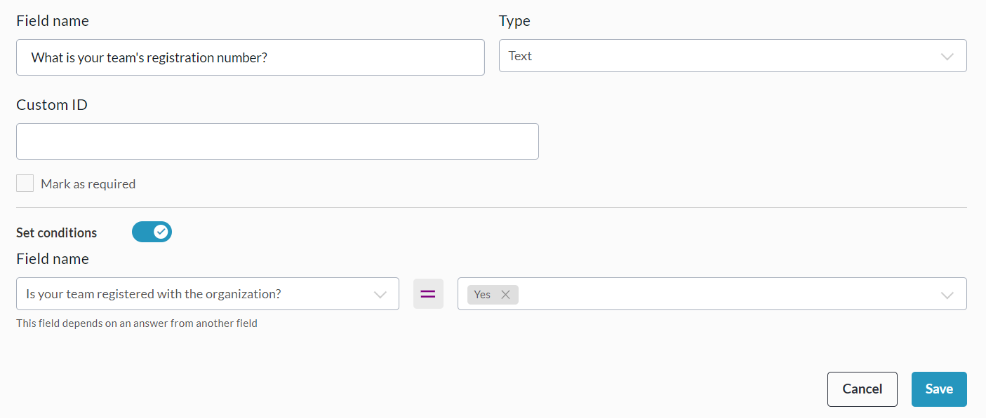 For example, a question like ‘What is your team’s registration number?’ could appear after the response ‘Yes’ is given for ‘Is your team registered with X organization?’.