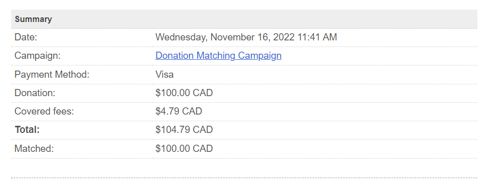 Donor Receipts will also show this matched amount, as well as the original donation amount.