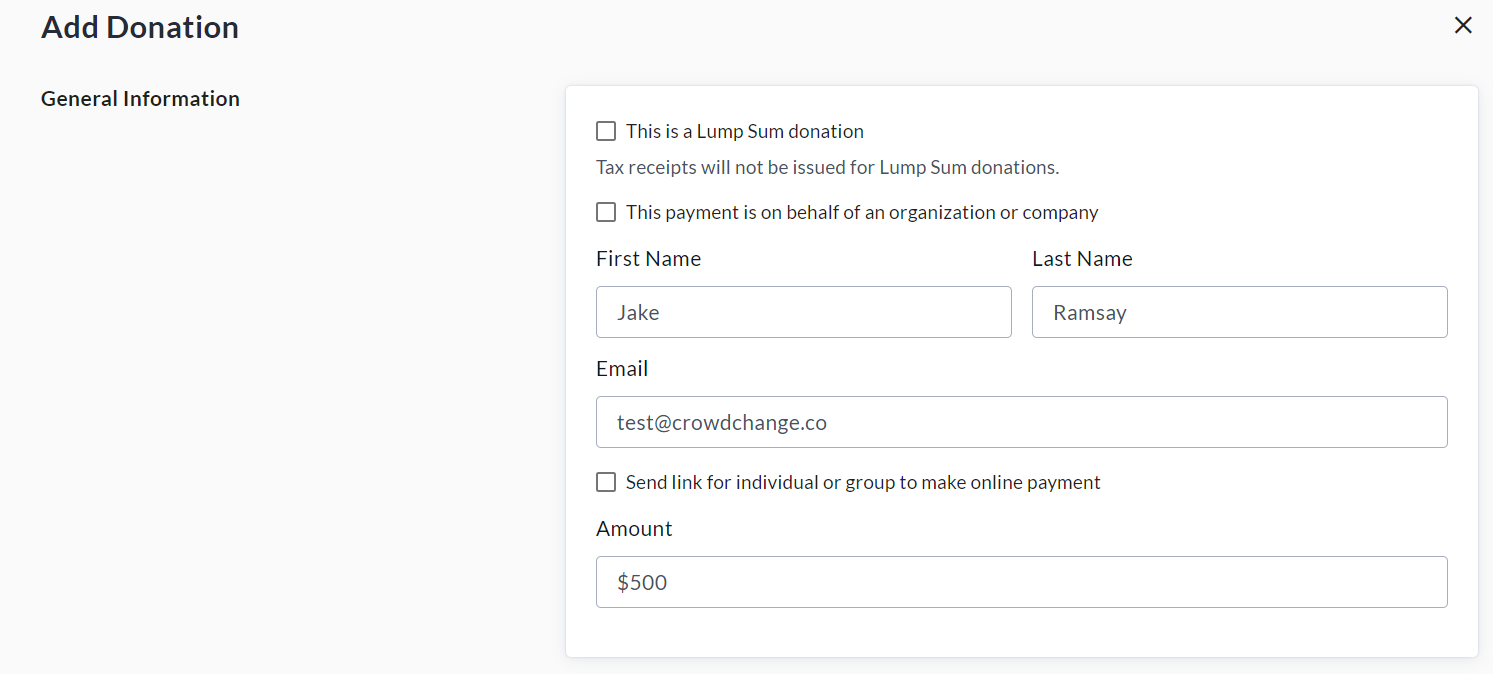 Click Add Donation and enter the donor’s details. Enter Tax Receipt Information if necessary.