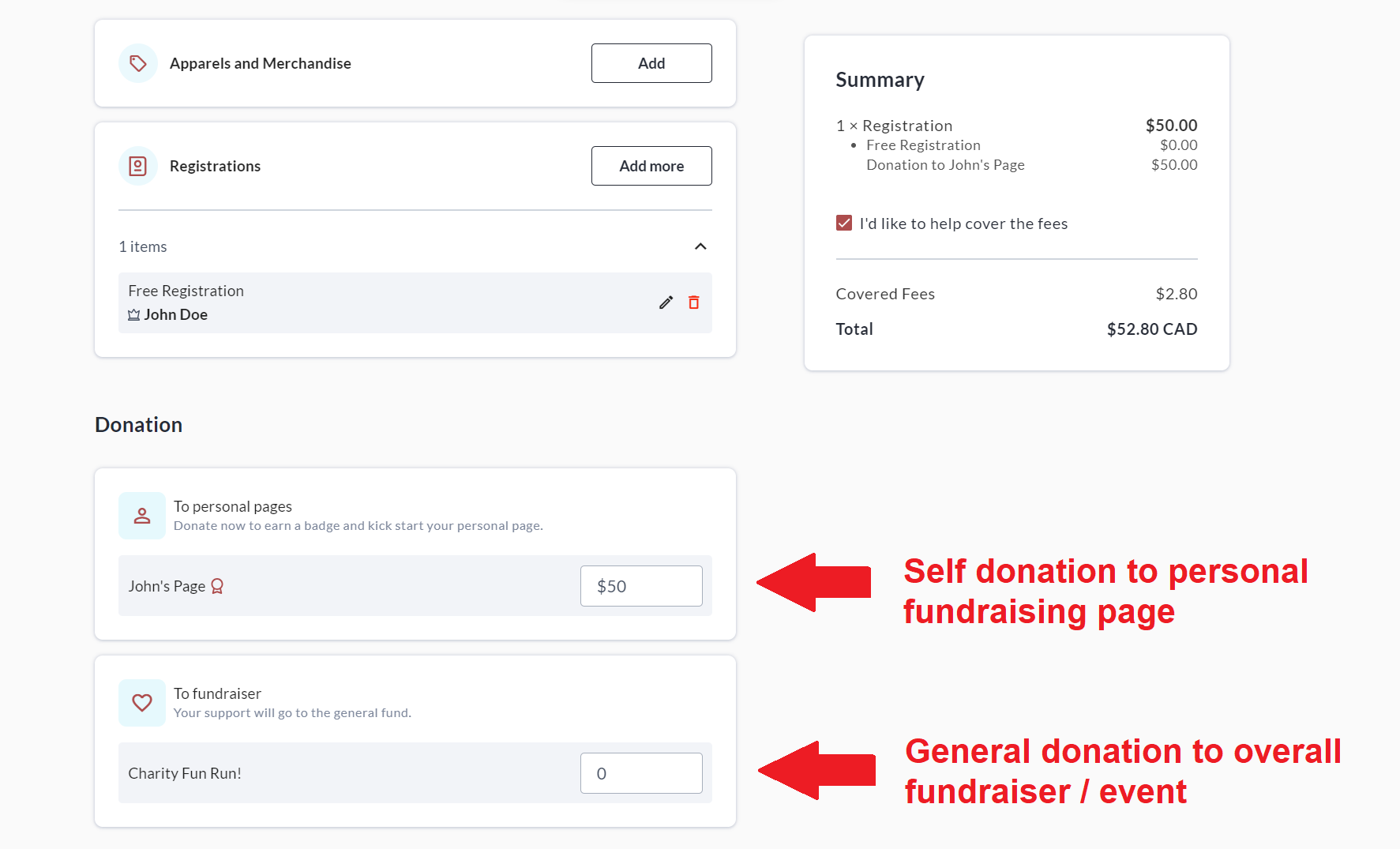 Step 6: On the Checkout page, you can review your transaction details, and make any desired adjustments to self donation and general donation amounts. (See screenshot below)