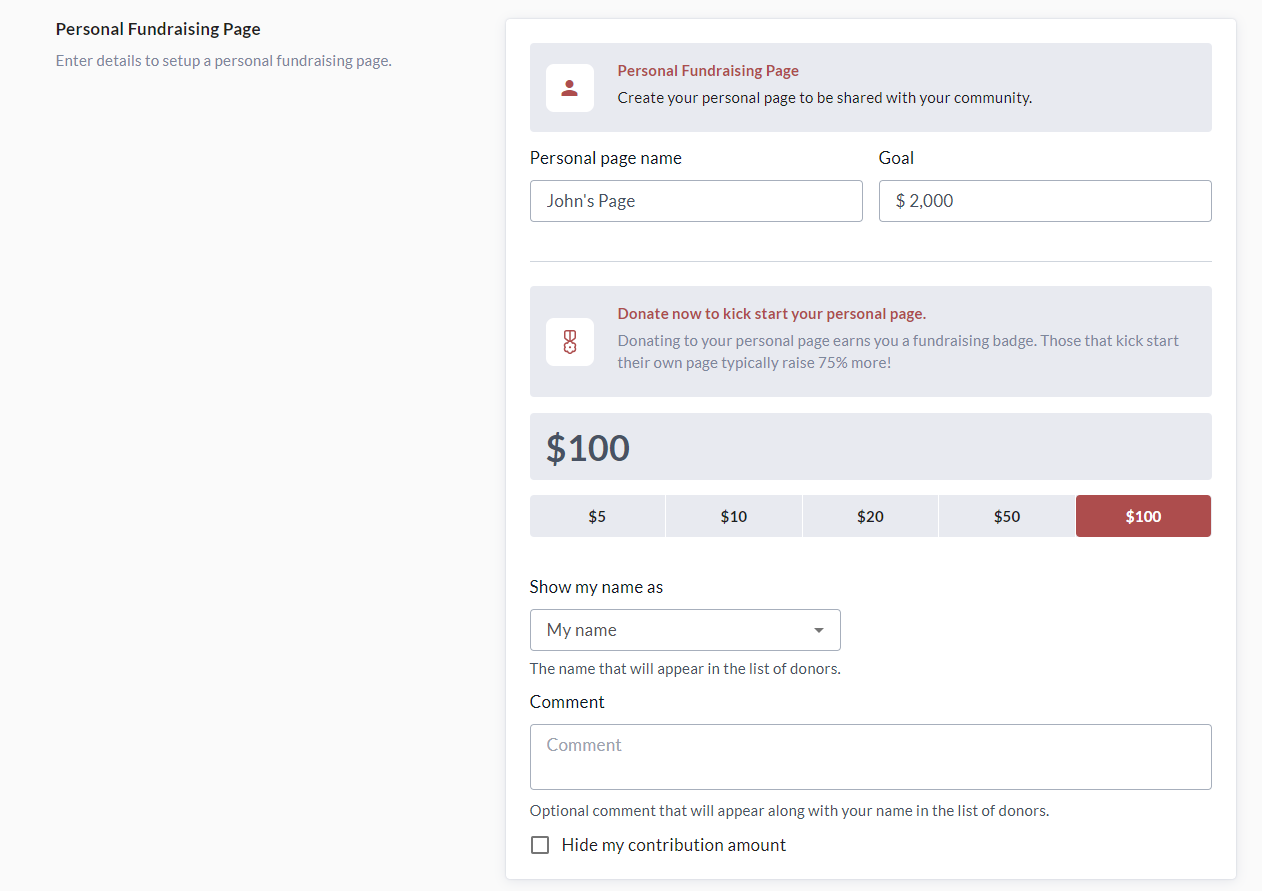 Step 4: After filling out Registrant Details, create a Personal Fundraising Page to share with friends and family and raise support! We recommend selecting a personal donation amount to kick-start your fundraising. You may set the donation display name, comment, and whether to show or hide the amount (shown below).