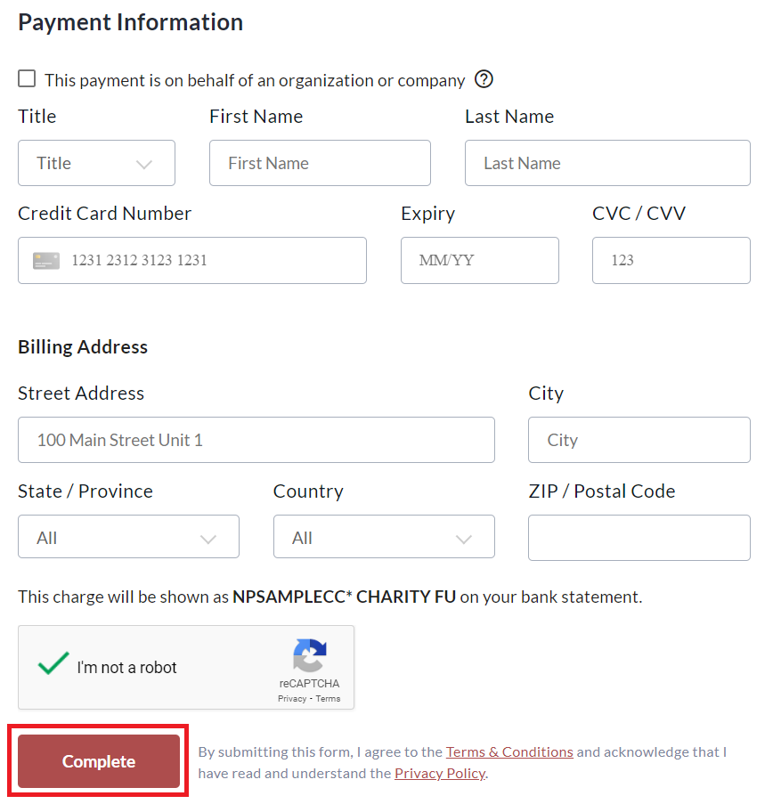Step 8: Enter your Payment, Billing and/or Mailing Information, and click Complete.