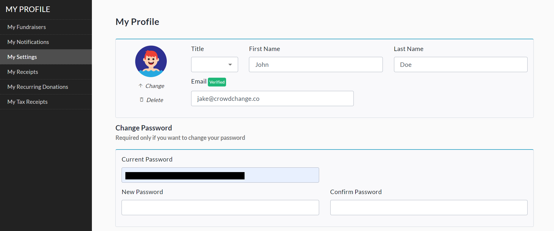 Your Profile is the place to go for changing your name, email address, and password. It also allows you to view your fundraisers, tickets, receipts and more.