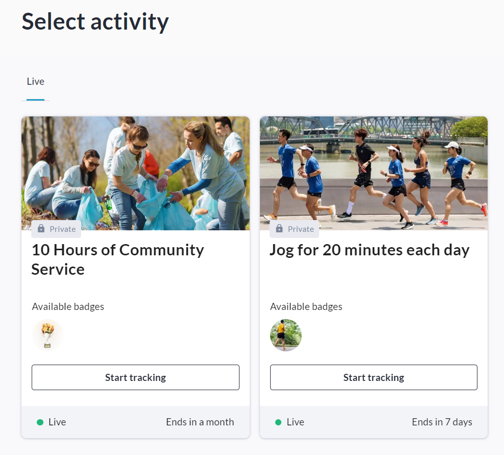 If you clicked See all available activities, click the Start Tracking button on the specific activity you would like to track progress towards. You may only track one activity at a time.