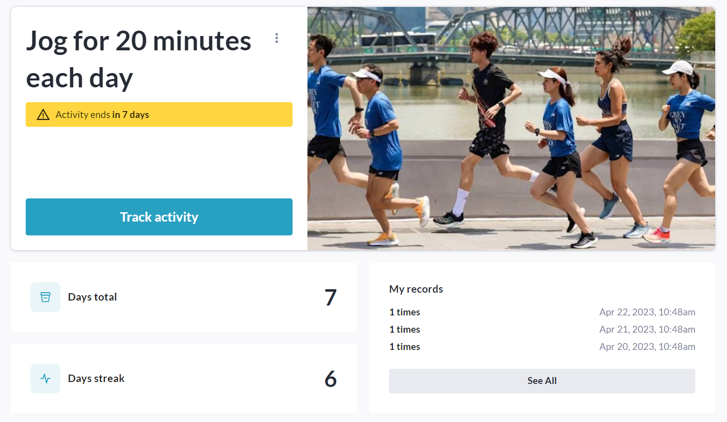 On the activity page, you can click the Start Tracking button, then the Track Activity button to track your first repetition of the activity:
